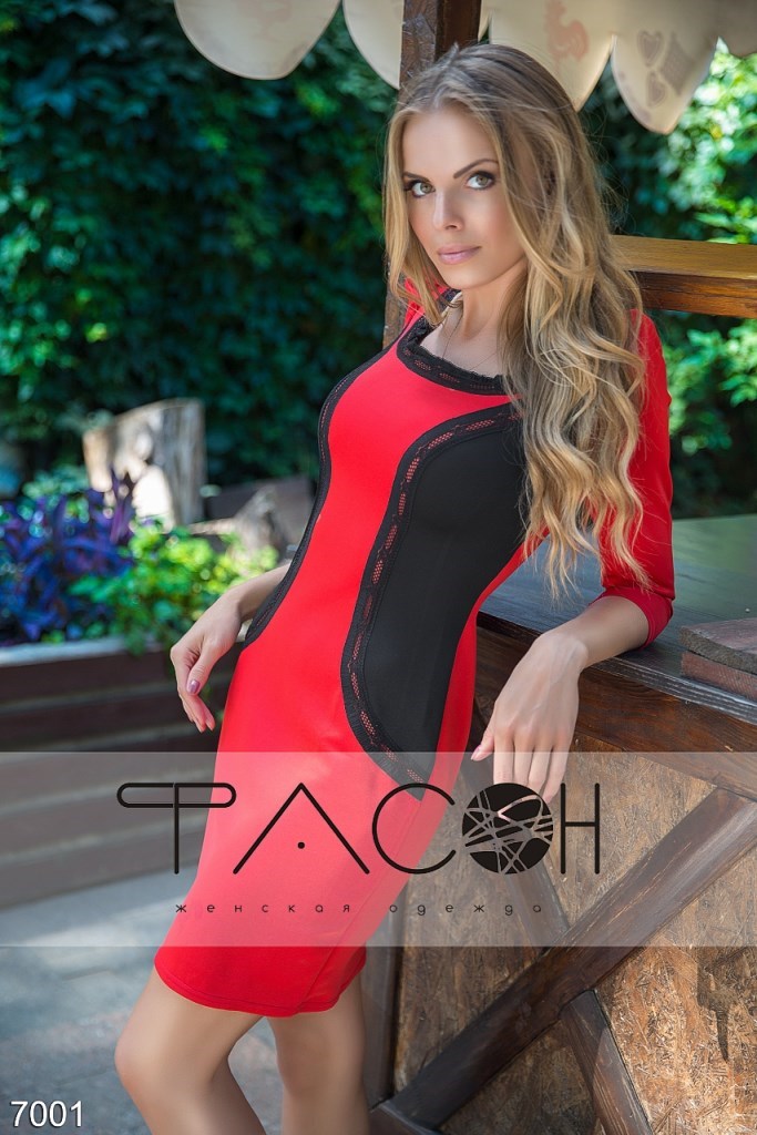 Платье декорированное черными вставками и кружевом, на спине молния.