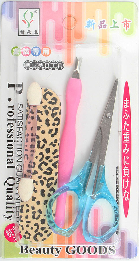 В набор входят:Ножницы маникюрные: длина - 9 см.Пилка для ногтей: длина - 8.5 см.Триммер для удаления кутикулы: длина - 9.5 см.Спонжики на палочке: диаметр - 6.5 см.