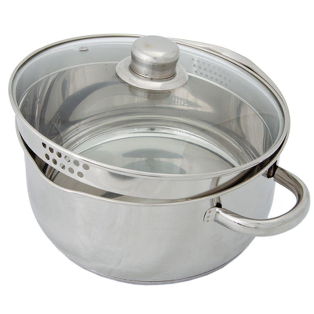 Кастрюля 4,9литра из нержавеющей стали с двумя сливами, мерной шкалой и капсульным индукционным дном, способствующим равномерному нагреву, укомплектована стеклянной крышкой с пароотводом внешней посадки, с полыми металлическими ручками, которые снижают ур