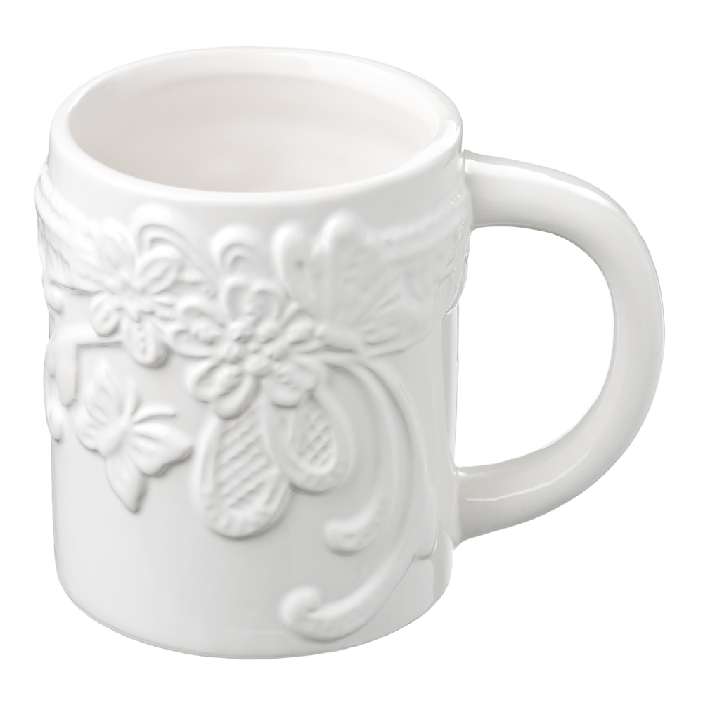 Кружка из изысканной белой керамики с оригинальным рельефным рисунком и удобной ручкой придется по вкусу любителям окружать себя красивыми и стильными вещами.