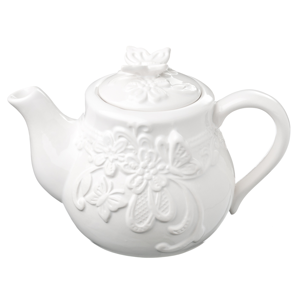 Заварочный чайник из белой керамики с оригинальным рельефным рисунком. Классическая форма, удобная ручка. Хорошо сохраняет тепло, подходит для длительного заваривания чая. Прост в уходе.