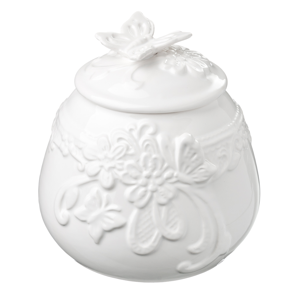 Белоснежная сахарница с рельефным рисункомв защитит сахар от попадания излишней влаги и посторонних запахов, украсит интерьер вашей кухни.