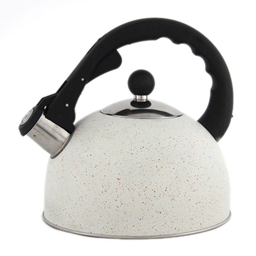 Чайник объемом 3 л изготовлен из нержавеющей стали, матовый, с несъемным свистком на кнопке и бакелитовой ручкой черного цвета, подходит для всех типов плит, кроме индукции.
