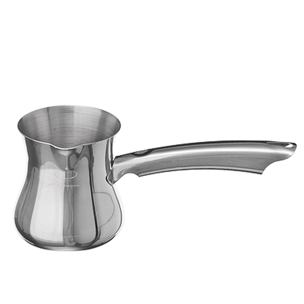 Турка объемом 380 мл изготовлена из нержавеющей стали и имеет бакелитовую ручку черного цвета, подходит для всех видов плит, кроме индукции.
