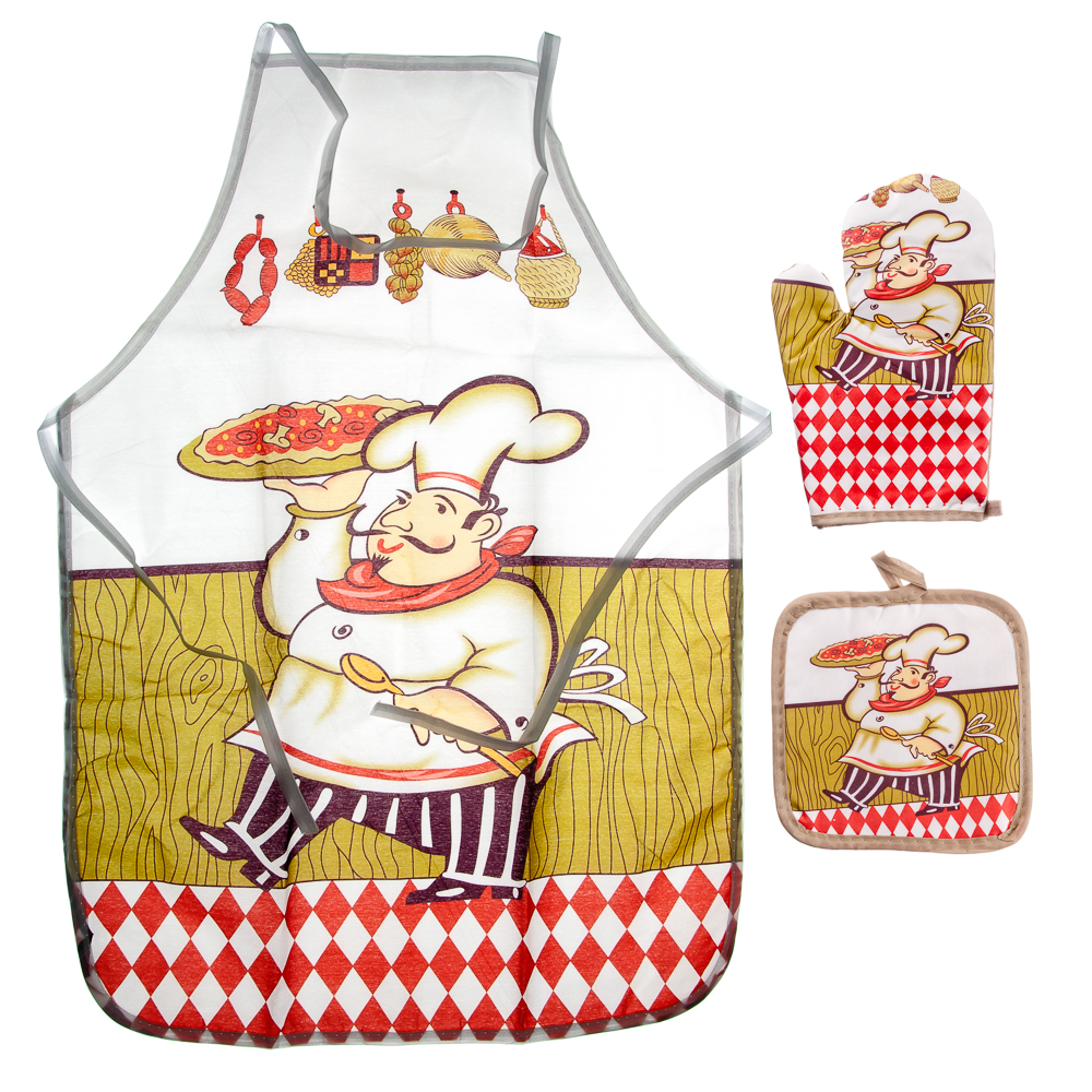 Набор состоит из нескольких предметов, которые нужны каждой хозяйке на кухне. Предметы в наборе изготовлены из качественных материалов, легко отстирываются.