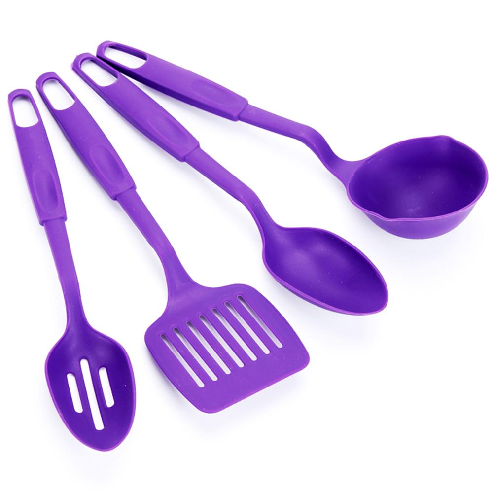 Набор кухонных принадлежностей яркого фиолетового цвета. Набор состоит из четырех элементов, незаменимых на кухне любой хозяйки.