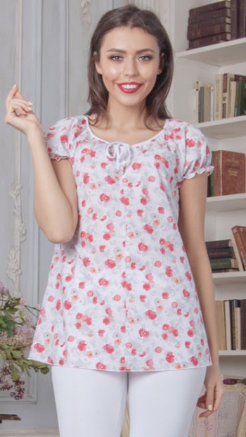 100%хлопок Блуза из хлопка свободного силуэта с рукавом реглан.По низу рукава проложена тонкая резинка,образующая мелкую сборку.Низ рукава и низ изделия обработаны на микрооверлоке.Горловина окантована трикотажной тесьмой,переходящей в завязки. Длина изделия от 63 см до 66 см, в зависимости от размера.