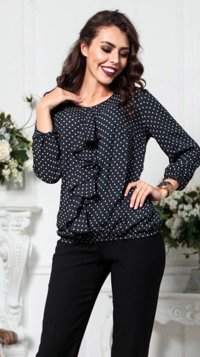 50%виск 50п/э Блузаиз шелковистой ткани прямого силуэта с нагрудной вытачкой и вертикальным валаном.Рукав втачной, 3/4.Низ рукава и низ блузы на резинке,горловина окантована.Длина изделия от 64 см до 70 см, в зависимости от размера.