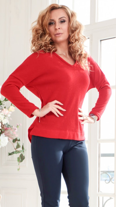 30%шерсть20%виск 50% п/э Блуза свободного силуэта из полушерстяного трикотажного полотна с ангорой.Линия плеча спущена,рукав длинный.Спинка длиннее полочки на 7 см.Длина изделия по спинке 75 см.