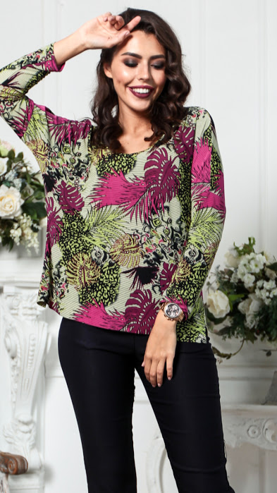 50%виск 50% п/э Блуза свободного силуэта из вискозы.Линия плеча спущена,рукав длинный.Спинка длиннее полочки на 7 см.Длина изделия по спинке 75 см.