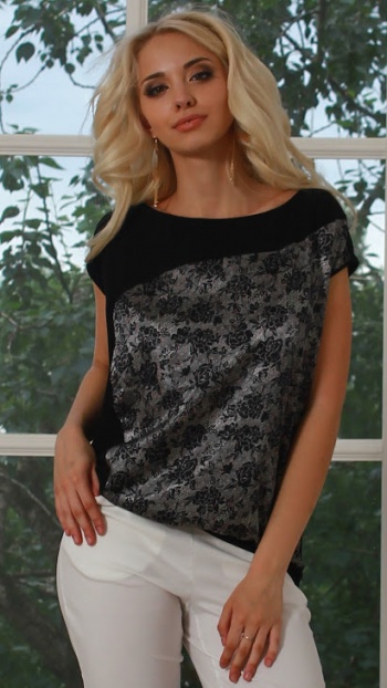 50%виск 50%п/эСвободная блуза на поясе со спущенной линией плеча, с вырезом "лодочка" ,спинка однотонная, на полочке ассиметричная фигурная вставка из атласной ткани с набивным рисунком.Длина изделия от 61 см до 65 см, в зависимости от размера.