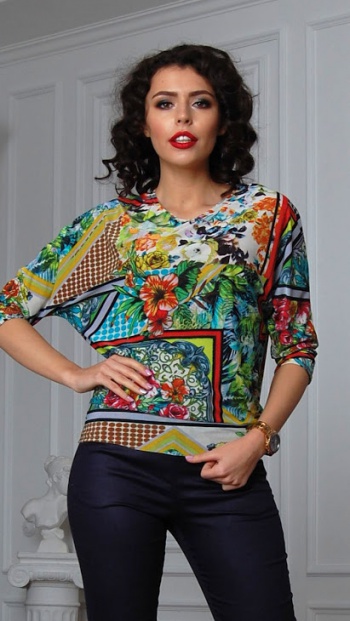 50%виск 50%п/э. Блуза на поясе из легкого, струящегося трикотажного полотна, рукав цельнокроеный, 3/4. Длина изделия от 57 см до 61 см, в зависимости от размера.