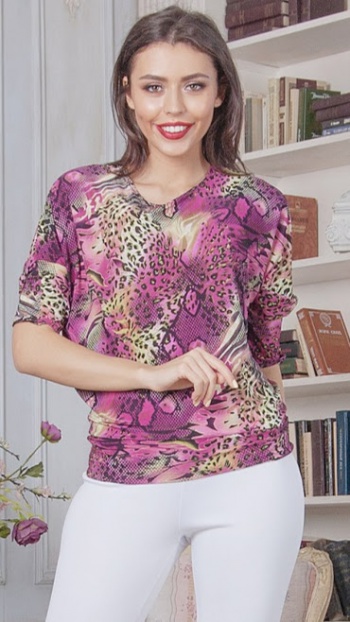 50%виск 50%п/э. Блуза на поясе из легкого, струящегося трикотажного полотна, рукав цельнокроеный, 3/4. Длина изделия от 57 см до 61 см, в зависимости от размера.